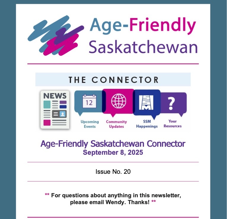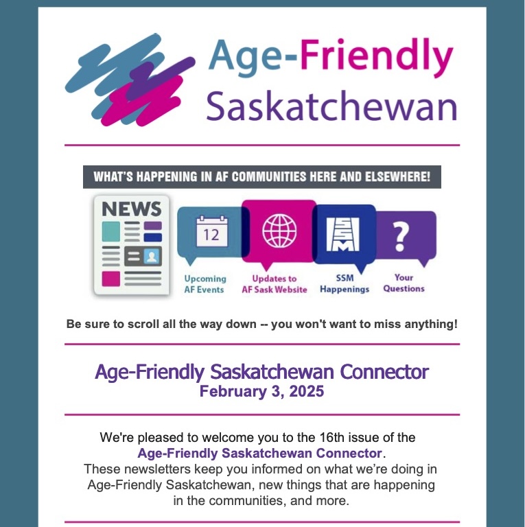 Approximately once a month, Age-Friendly Saskatchewan sends out a newsletter called The Connector. As you can see from the banner above, it includes upcoming AF Events, updates to this website, things that are happening at SSM (Saskatchewan Seniors Mechanism), and answers to queries.